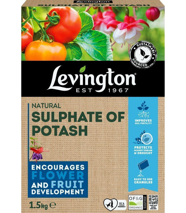Levington® Natural Sulphate of Potash is used for bigger, healthier fruit and flowers. It is an organic, fast acting source of potassium and protects against disease and drought.