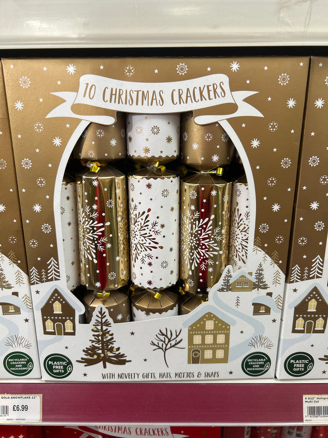 This pack of ten family crackers is a fun and engaging item for Christmas, featuring a gold snowflake design printed on a gold or white base and finished gold hotstamp with gold curling ribbon. These family crackers contain a hat, motto, snap and a gift of either a bookmark, sudoku and pencil, santa finger puppet, mystery calculator, puzzle, mini origami, snap game, 3D tree, shape puzzle and jigsaw.