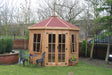 There are lots of ways to make your garden more appealing when it comes to enjoying the outdoors, the Octagonal summerhouse is the perfect answer, a place to relax and unwind in your garden. Double doors fitted with antique hinges and ornate handle with 3 lever lock, 2no opening and 2no fixed windows with a choice of Georgian, square or diamond leaded glazing. Shingle roof tiles available in black, green, red or slate are all included as standard.