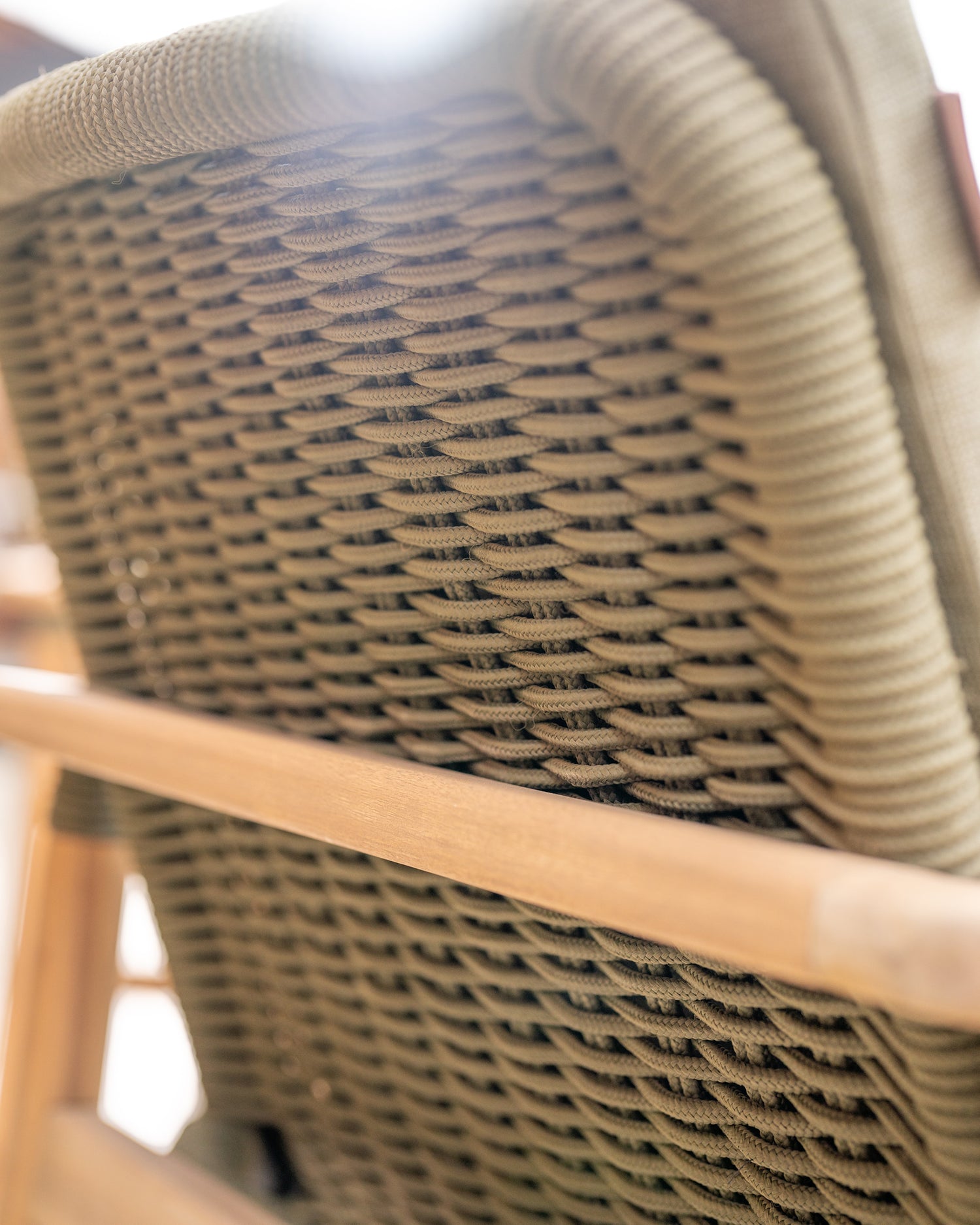 Crafted from FSC®-certified acacia wood with a beautiful natural rose-grey finish, it combines sustainable materials with contemporary design. The green polyester rope seat and back offer supportive comfort, while the included RainSafe cushions dry faster after rainfall staying ready to use throughout the year.