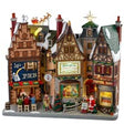 If you're looking for a German Christmas, Wintergarten Lane has everything you need. On the left of this façade is the Cask & Stein pub, which has three men sitting at the bar, enjoying a beer. In the middle is the Wintergarten Christmas Shoppe, which has all the gifts you need. Tired? On the right, you have Pretzel Haus, where you can enjoy a fresh-baked treat. On the roof, Santa is flying away on his reindeer-pulled sleigh.\n\n1. Chasing lights at the pub are on mimicking for "pouring" beer effect.\n2. Lights behind the wreath decorations along the cornices are on.
