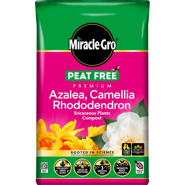 Miracle-Gro Peat Free Premium Azalea, Camellia & Rhododendron, Special Plants Compost is part of the high-performing Miracle-Gro peat-free range. Specially formulated to cater the needs for all ericaceous plants that love acidic growing conditions, this peat-free compost contains patented Smart Fibre™ and Waterlock™ Technologies to ensure your ericaceous plants have all the nutrients they need to survive.